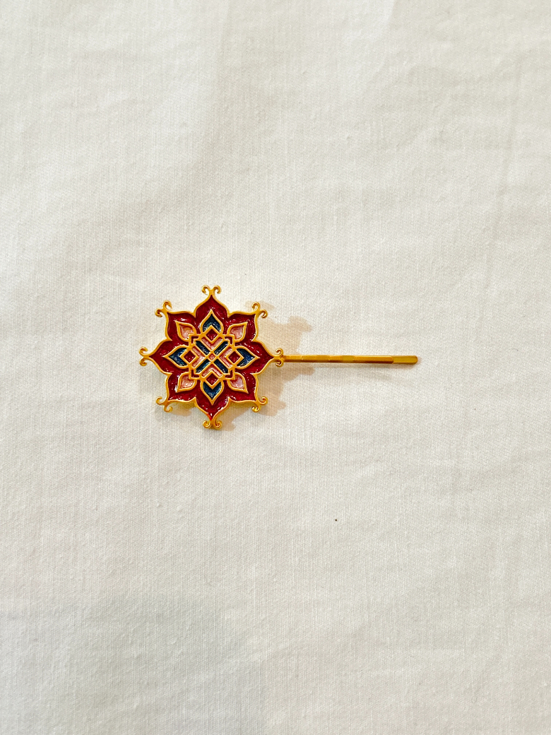 メダリオンを模したオリエンタルな色使いやモチーフが印象的なヘアピンです。