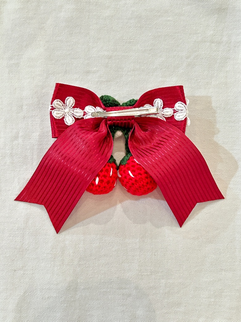 いちごの編みぐるみがゆらゆら揺れるリボンクリップで、