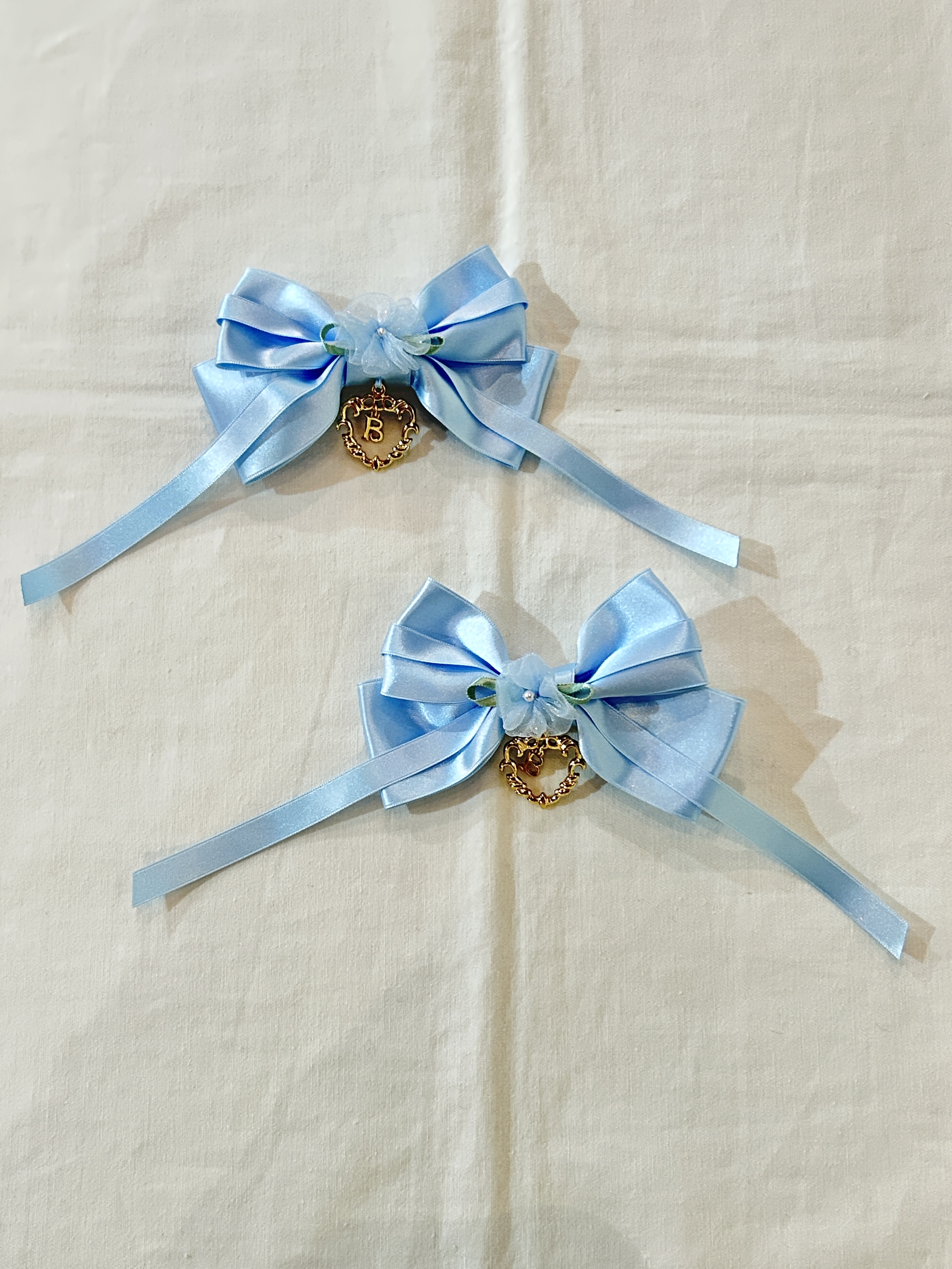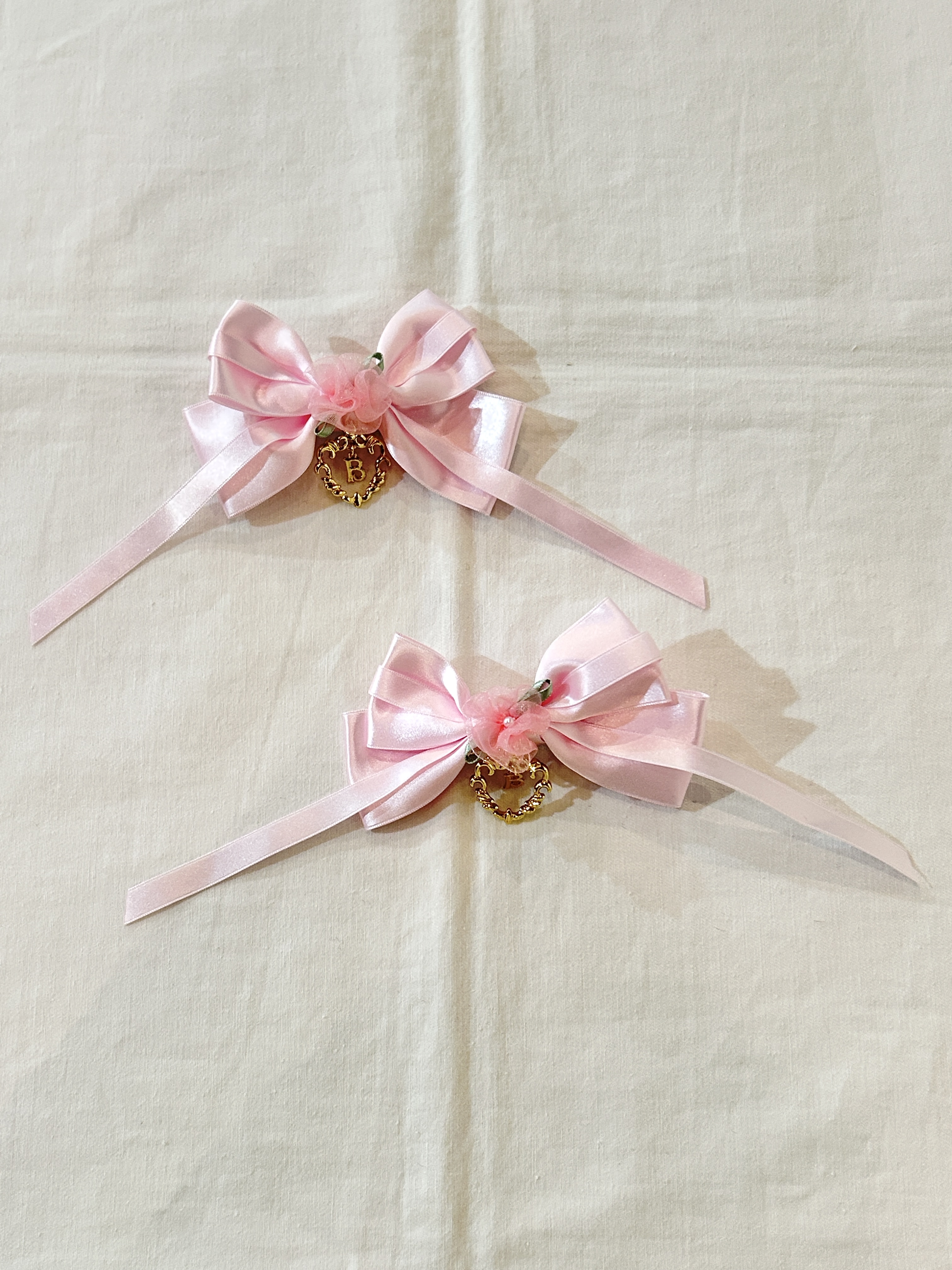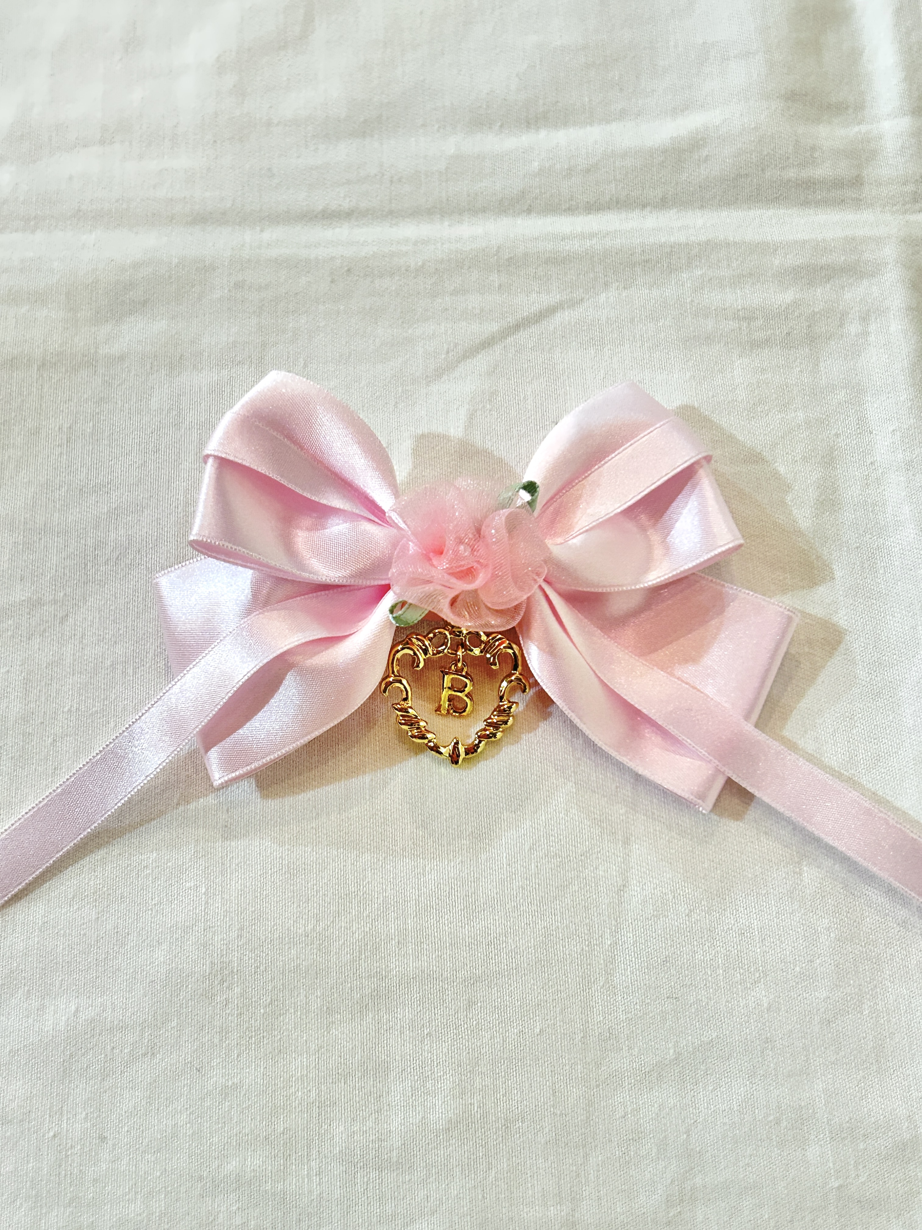 太いサテンリボンに細いリボンを重ね、真ん中にオーガンジーミニバラをあしらいました