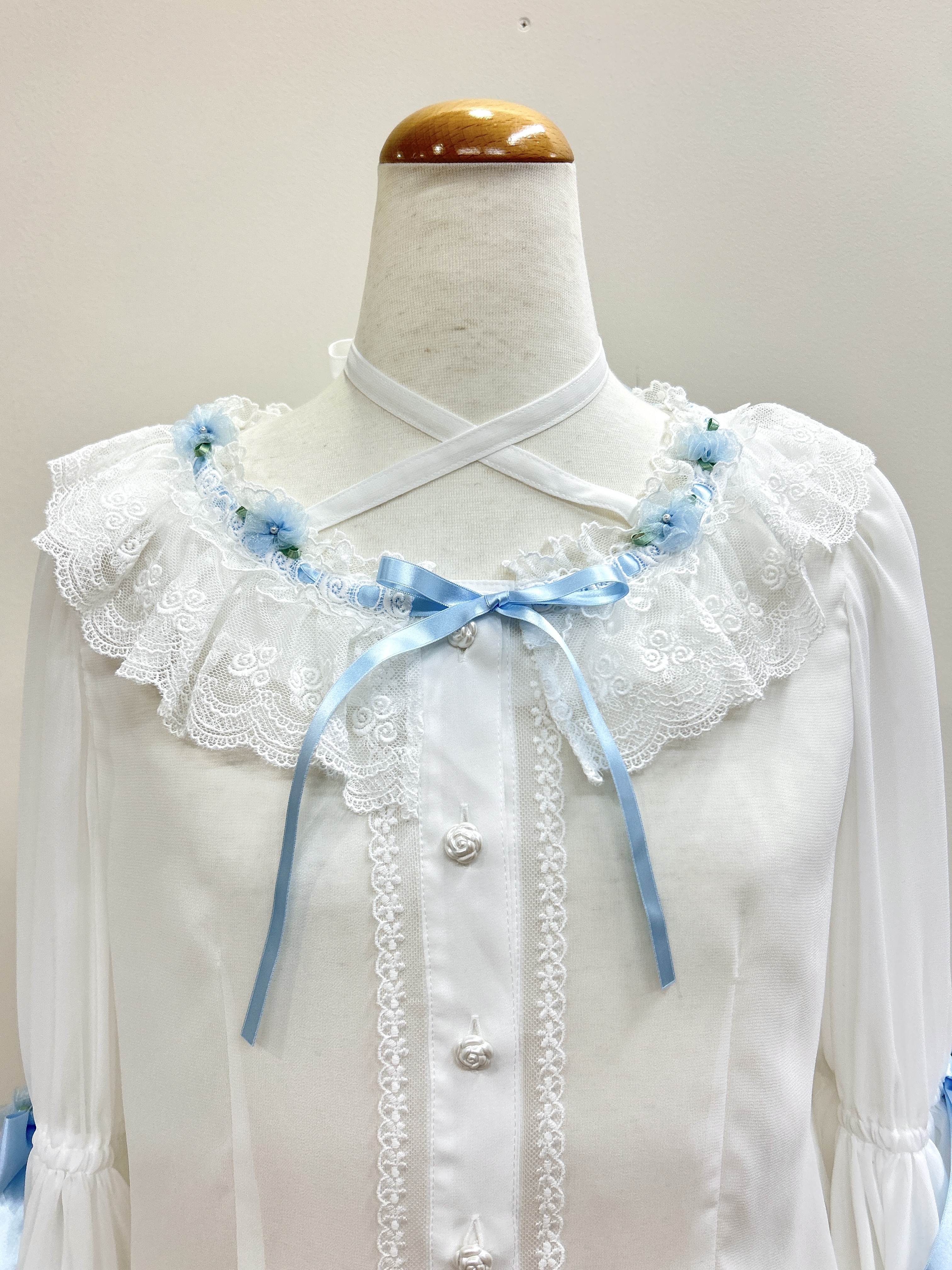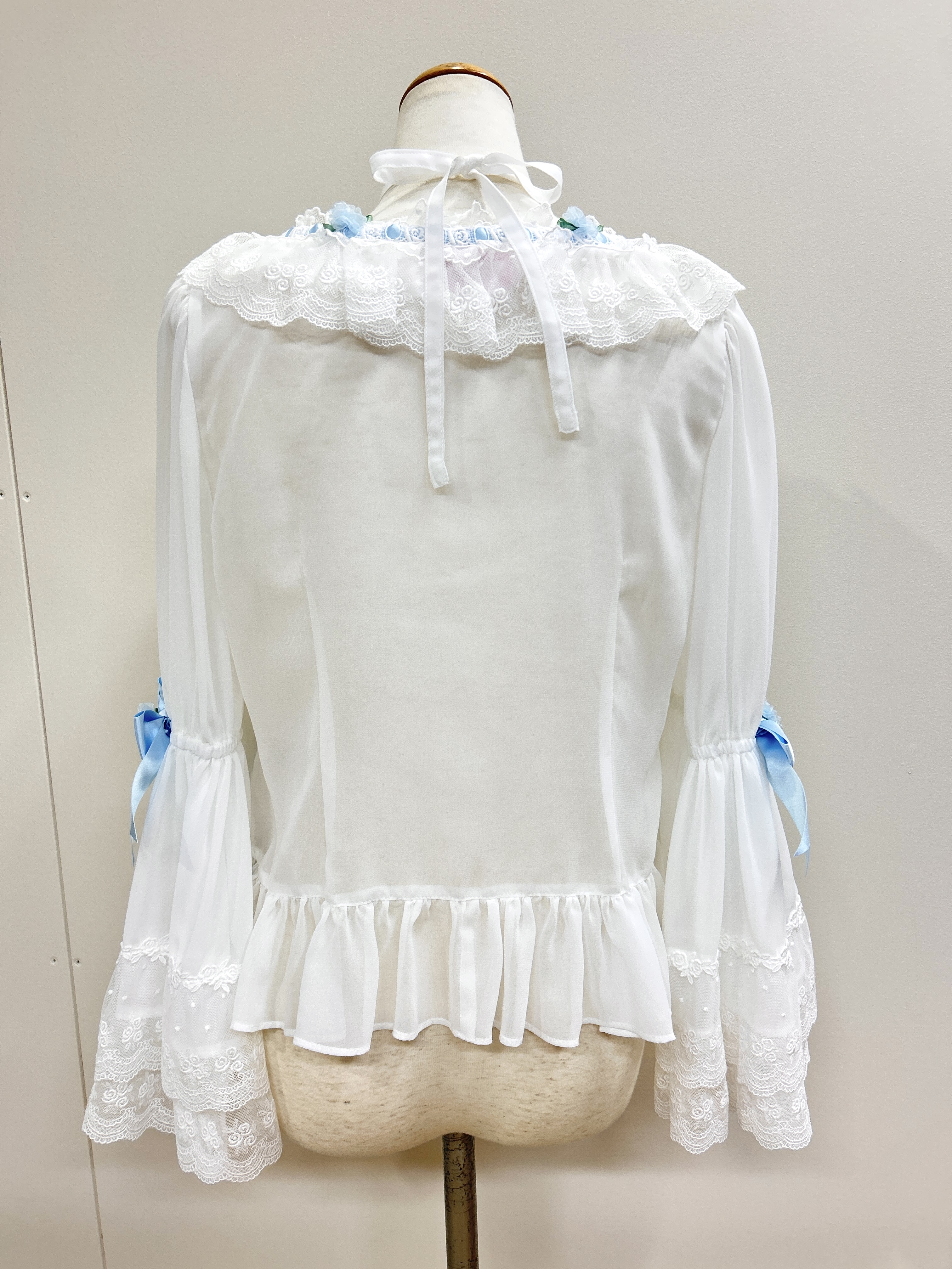 オーガンジーミニバラを襟ぐりにあしらった豪華な姫袖のシフォンブラウスです