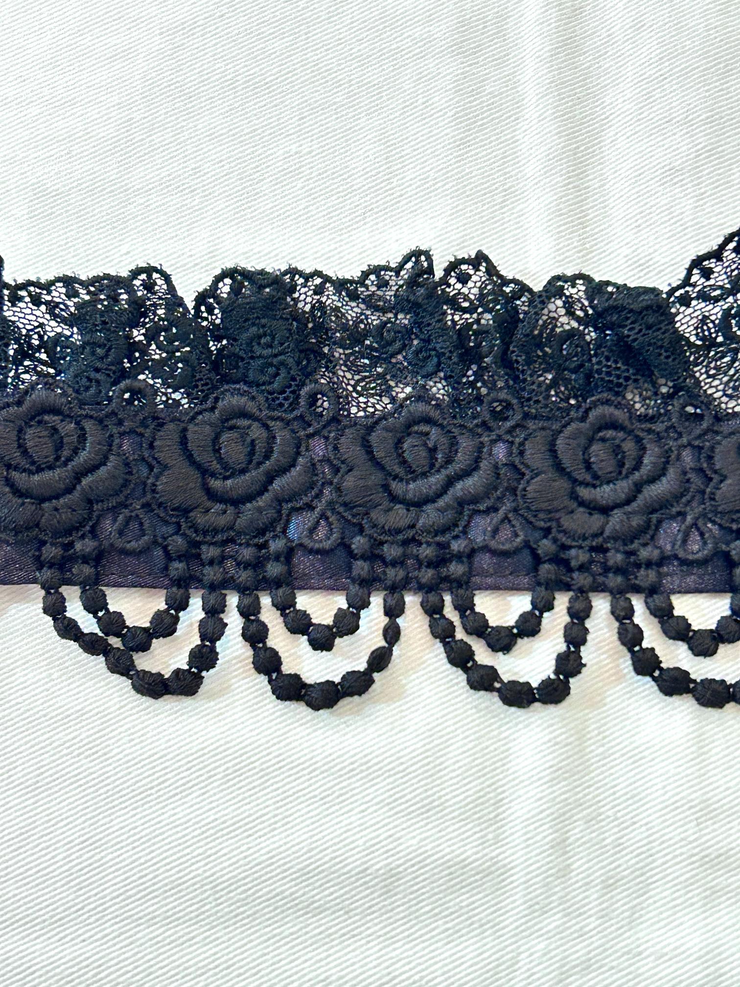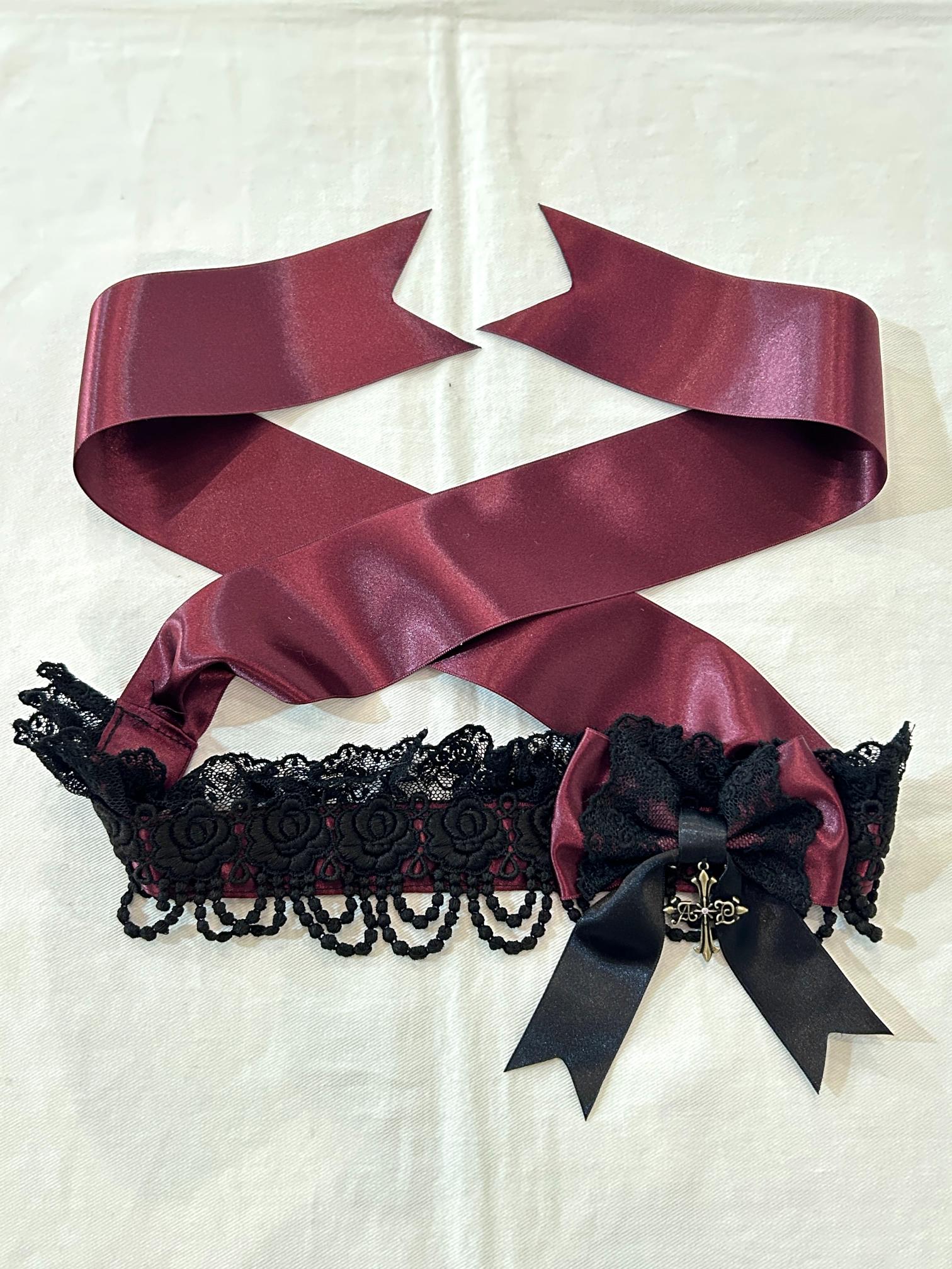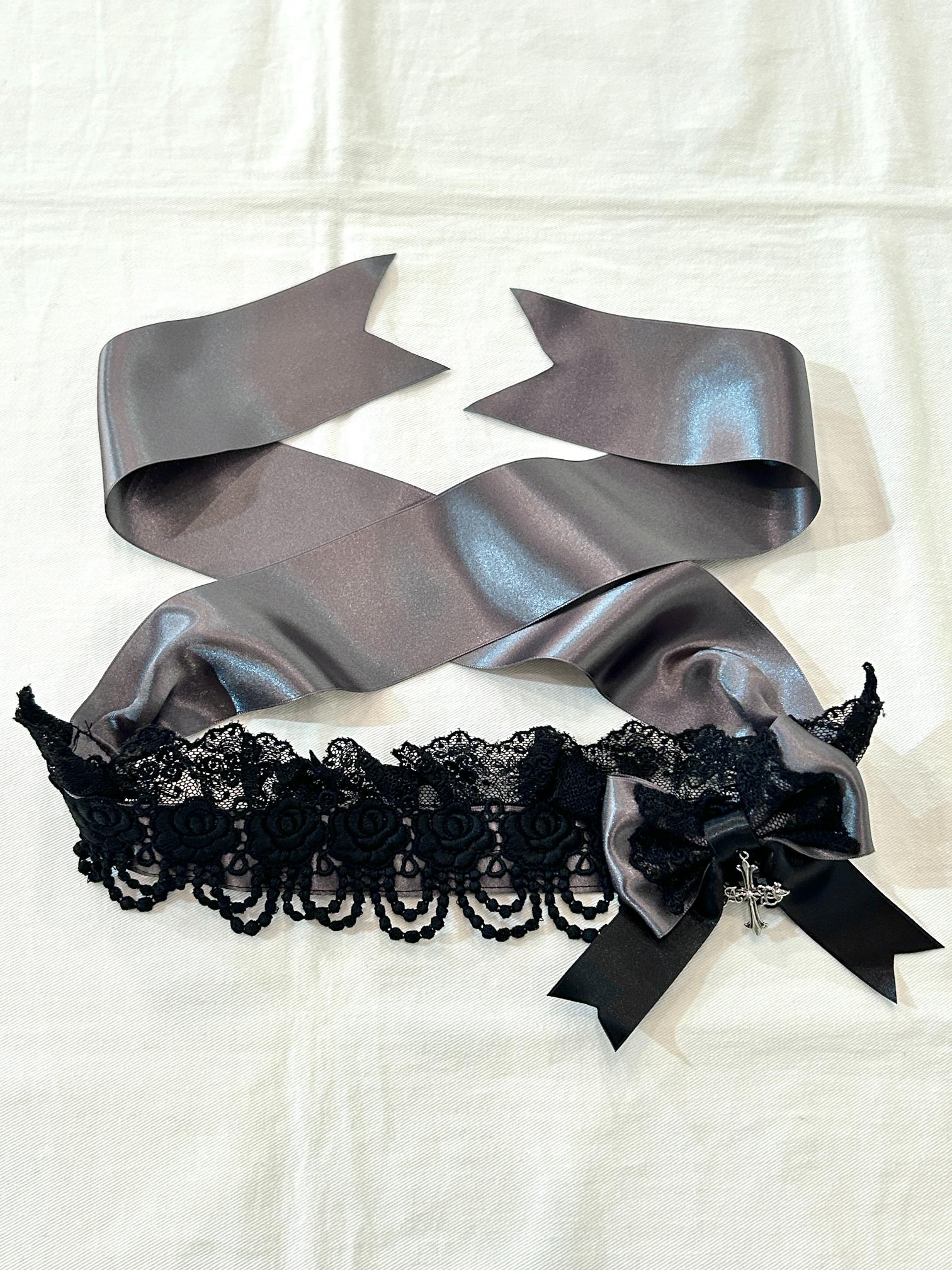太めのサテンリボンにバラのケミカルレースをあしらいました